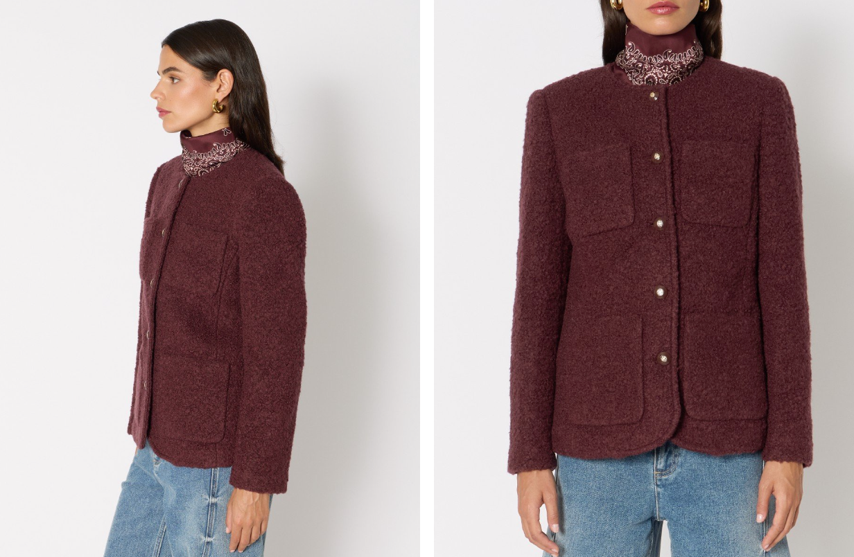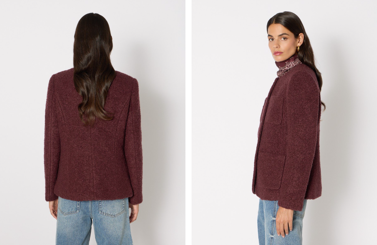 La veste VERONA s’impose comme une pièce forte et élégante de la saison. Confectionnée dans une matière effet bouclé au toucher doux et texturé, elle séduit par sa teinte bordeaux chaleureuse et sa coupe longue structurée. Son col rond et ses poches plaquées lui confèrent un style intemporel, tandis que les boutons sur le devant apportent une finition raffinée. À porter ouverte sur un jean pour un look casual chic, ou ceinturée pour souligner la silhouette avec élégance.